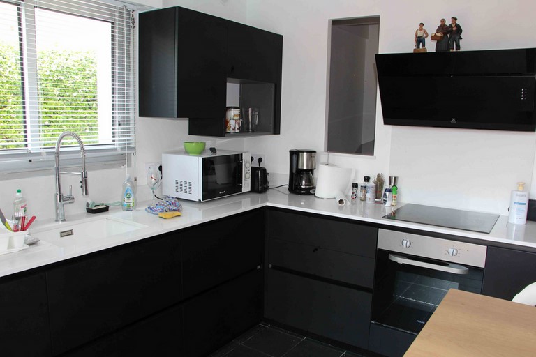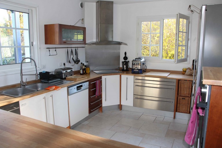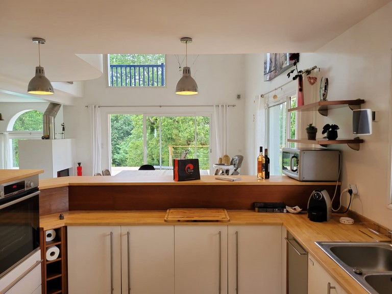 Cuisine ouverte et équipée. Four, hotte aspirante, four micro-ondes, réfrigérateur combiné avec congélateur, plaque induction, lave vaisselle, grille pain, cafetière, bouilloire, robot de cuisine.