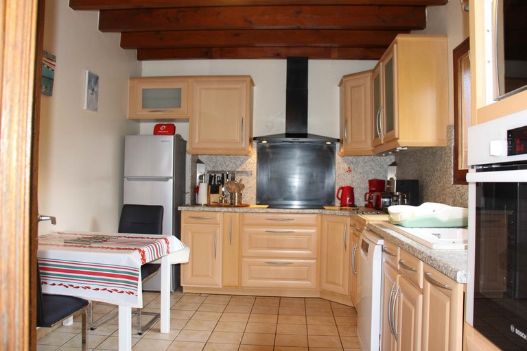 Cuisine séparée et équipée. Four, hotte aspirante, four micro-ondes, réfrigérateur combiné avec congélateur, plaque vitrocéramique, lave vaisselle, grille pain, cafetière, bouilloire.