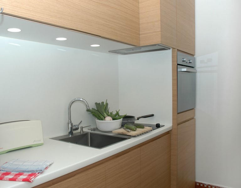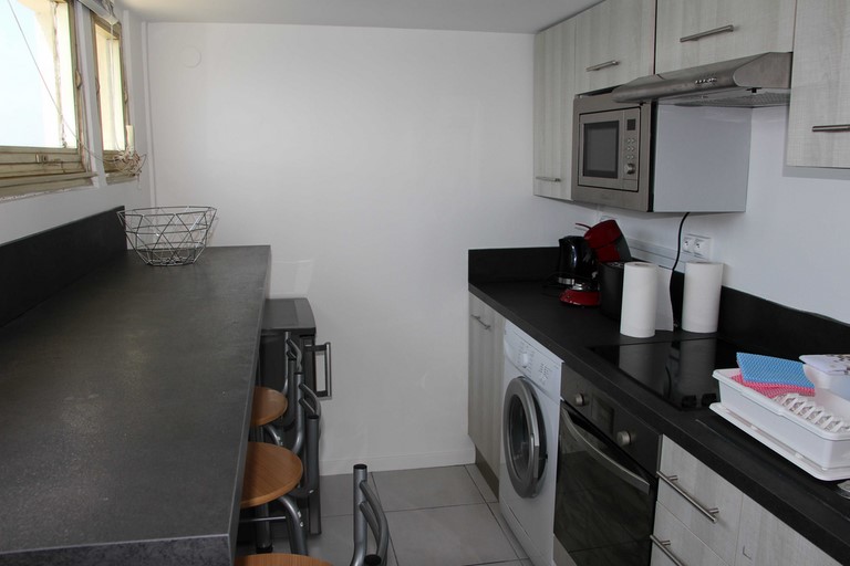 Cuisine équipée et ouverte. Four, réfrigérateur, plaques à induction, lave vaisselle, cafetière, bouilloire.