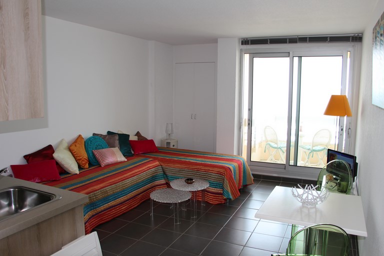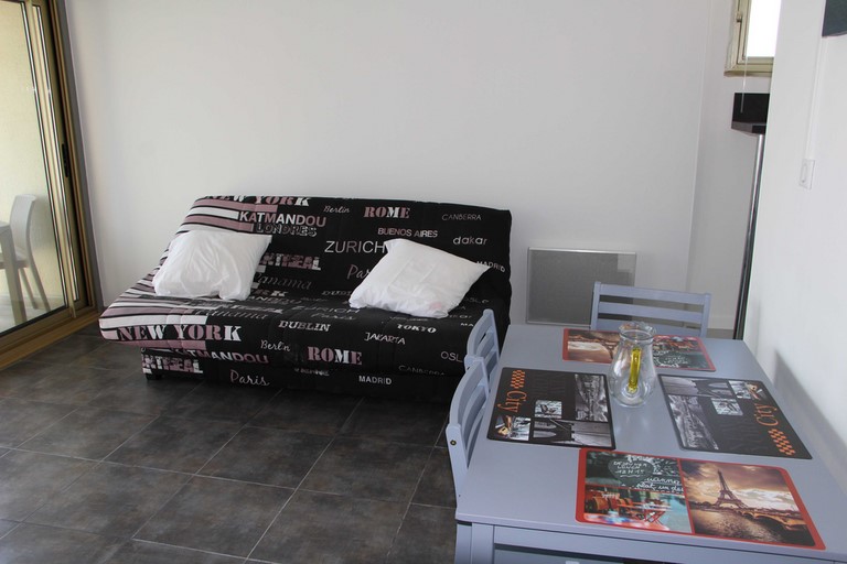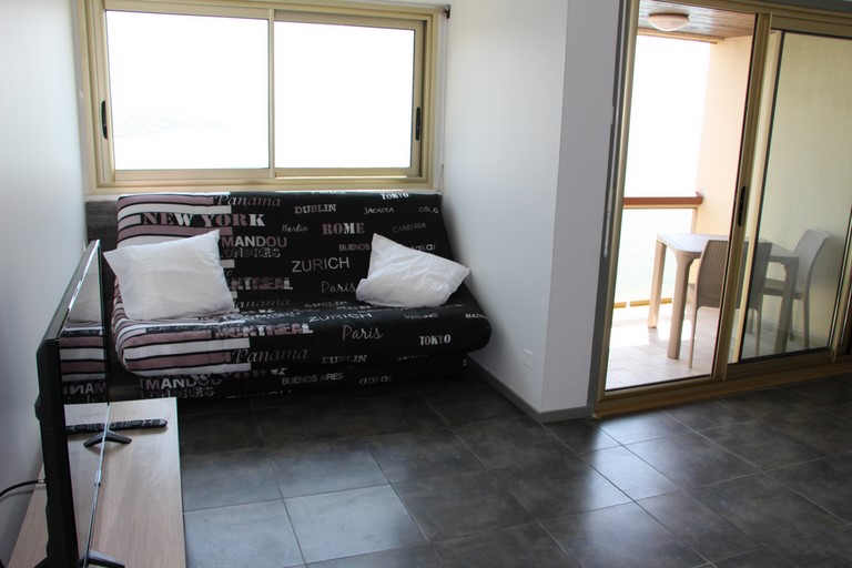 Salon – Séjour orienté Sud avec accès balcon. Un convertible de 190 x 160. Télévision avec lecteur dvd.