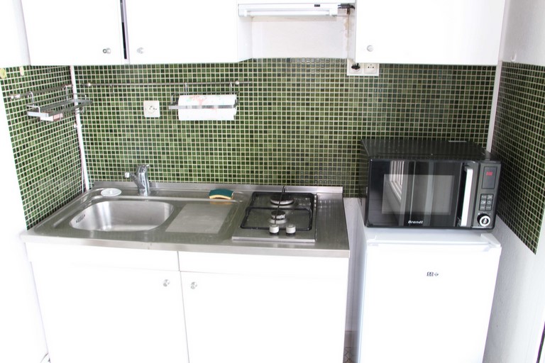 Cuisine ouverte et équipée : Réfrigérateur, plaque électrique, four micro-ondes, cafetière, bouilloire, grille pain.