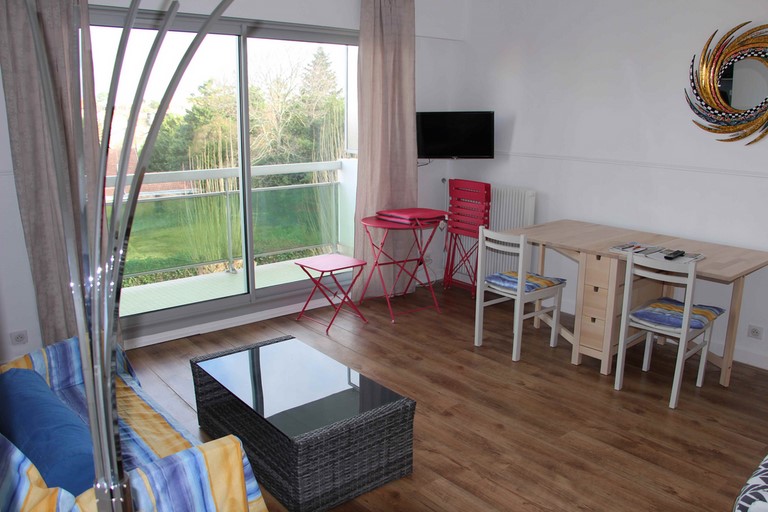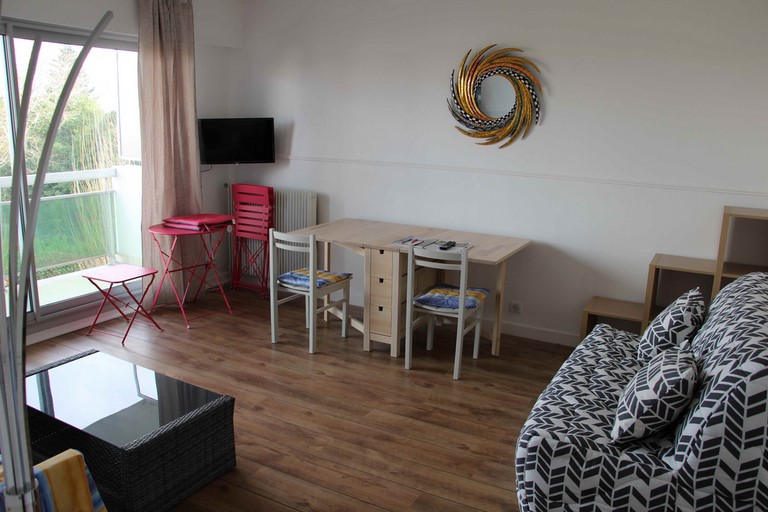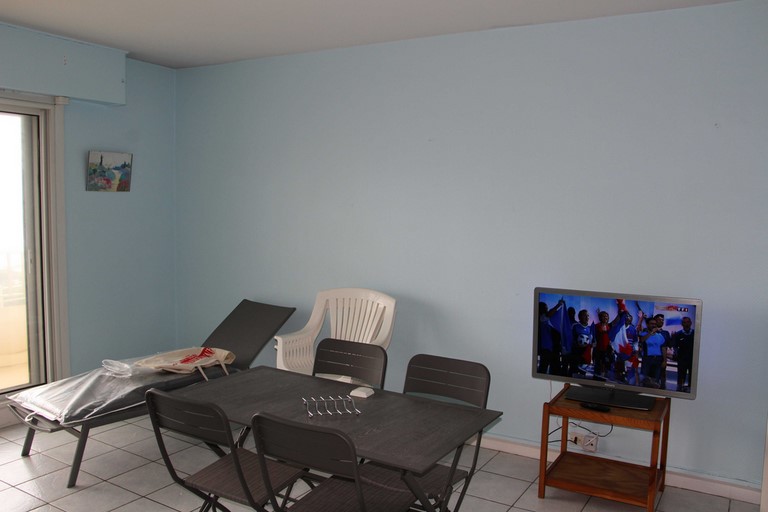 Salon – Séjour avec accès balcon. Un canapé convertible en 140. Un lit pliant de 90. Télévision.