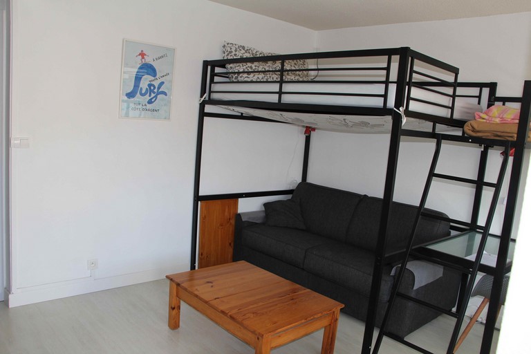 Salon – Séjour avec un canapé convertible deux places (160) et un lit de 90 en mezzanine. Espace bureau. Télévision. Accès terrasse.