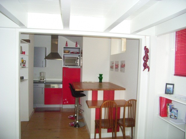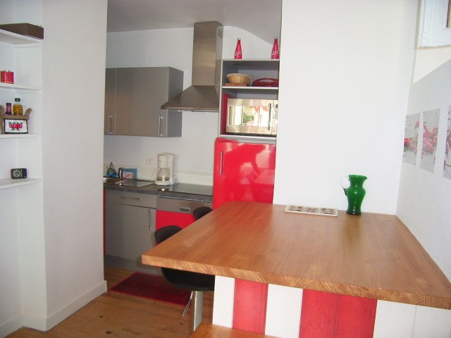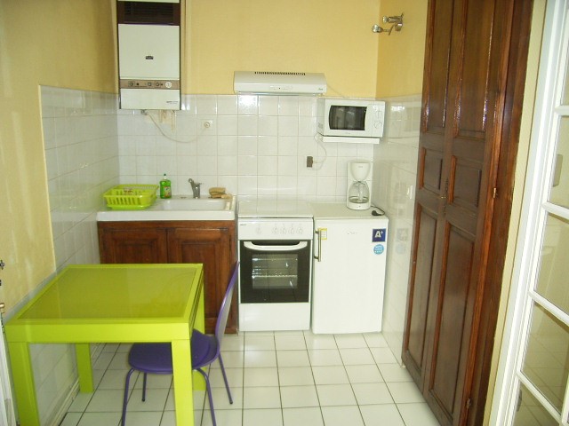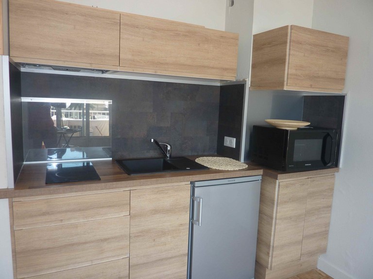 Cuisine équipée et séparée. Plaque électrique, réfrigérateur, lave linge, bouilloire, cafetière, micro ondes, grille pain. Accès terrasse.