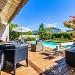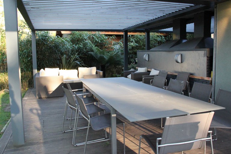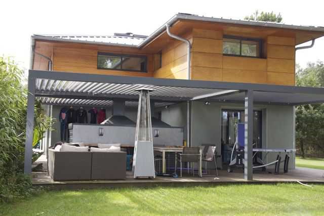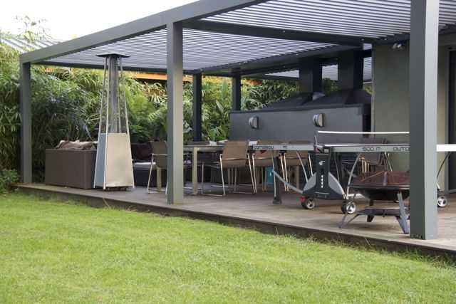 Le côté nord, avec la grande salle de jeux des enfants s’ouvre sur une grande terrasse bioclimatique avec couverture ouvrable télécommandée. Cette terrasse donne sur un jardin zen avec cascade d’eau pour retrouver une oasis de paix et sérénité en regardant le couché du soleil. La terrasse est de 75 mètres carrés et elle est équipée d’une cuisine d’été avec barbecue, plancha et four à pizza pour bien profiter de la compagnie de vos amis pour vos soirée d’été.