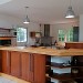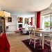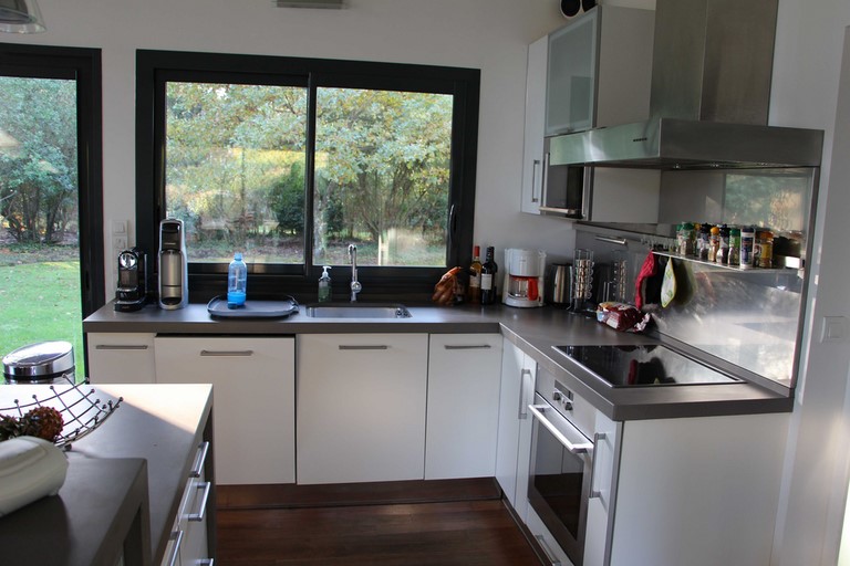 Cuisine ouverte et équipée. Four, hotte aspirante, four micro-ondes, réfrigérateur combiné avec congélateur, plaque induction, lave vaisselle, grille pain, cafetière, bouilloire, robot de cuisine.