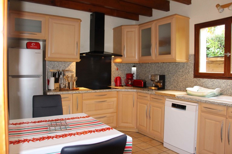 Cuisine séparée et équipée. Four, hotte aspirante, four micro-ondes, réfrigérateur combiné avec congélateur, plaque vitrocéramique, lave vaisselle, grille pain, cafetière, bouilloire.
