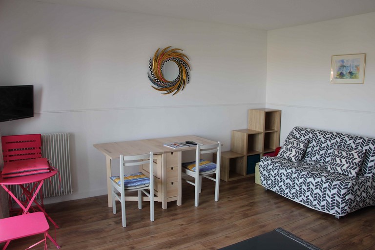Salon – Séjour orienté Sud avec accès balcon. Un convertible de 190 x 160. Télévision avec lecteur dvd.
