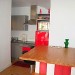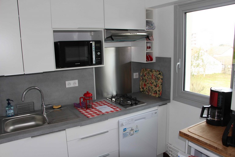Cuisine équipée et ouverte. Four, réfrigérateur, plaques à induction, lave vaisselle, cafetière, bouilloire.