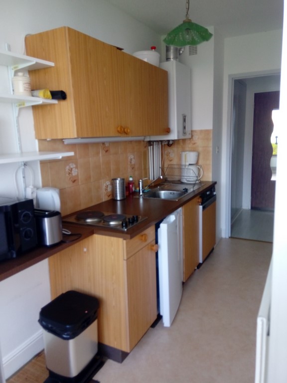 Cuisine équipée et semi ouverte. Plaque gaz, hotte, réfrigérateur, lave vaisselle, bouilloire, cafetière, micro-ondes, grille pain.