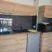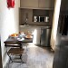 Cuisine équipée et ouverte. Réfrigérateur, plaques induction, hotte aspirante, cafetière, bouilloire.